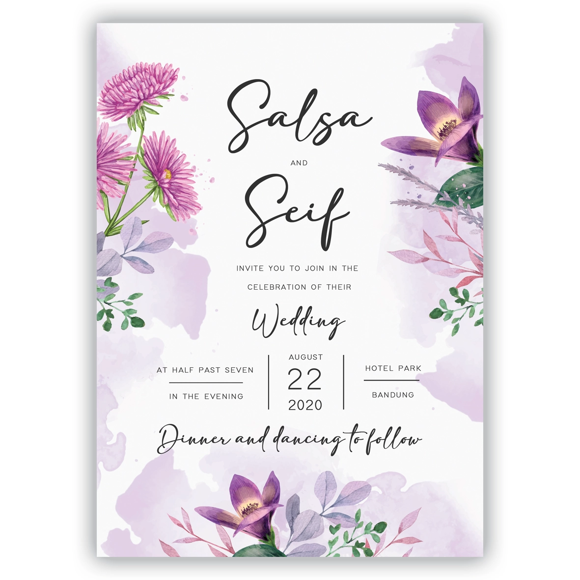 Invitación de purpuras y floridos. Se entrega en un papel verjurado de 220gr o estucado 300gr, ambos ideales para entregar a tus invitados. ¡Personalízala como quieras, elige cantidad y a celebrarlo!